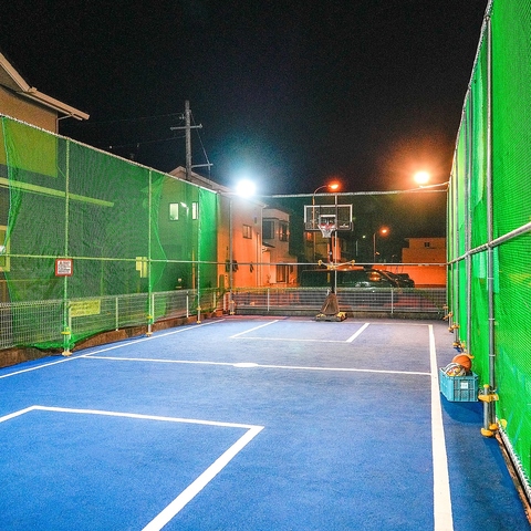 お店の外には本格的なバスケットコートを完備。食事の前後に家族や友人と気軽に体を動かせる、遊び心あふれる空間です。夜でも明るい照明で安心して楽しめ、子どもから大人まで一緒に盛り上がれるのが魅力。食事とアクティビティを同時に満喫できる、特別なひとときを提供します。