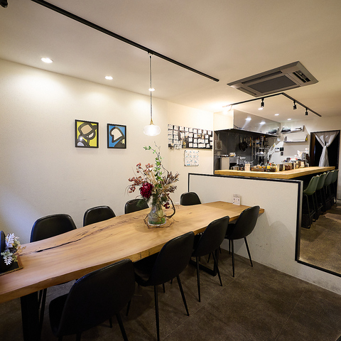 美しい曲線を描く大きな一枚板の8名掛けテーブル席がございます。壁にはモダンなアートが飾られ、落ち着いた大人の隠れ家のような雰囲気。ご家族での夕食や、少人数のグループ利用に最適です。窓際に並ぶボトルがお洒落な空間を演出し、日常を少し特別に変えてくれる、そんな素敵なひとときを約束します。