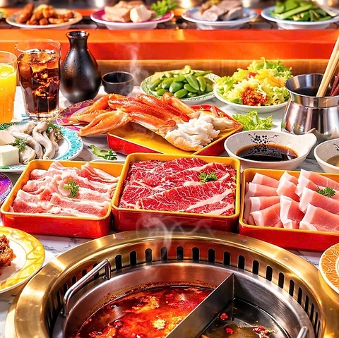 当店のすべてを詰め込んだ、食べ放題コースです。とろけるような食感の「和牛ロース」を中心に、国産牛や美月豚といった厳選肉が勢揃い。さらにボイルカニやホタテ、大ぶりの海老といった豪華海鮮まで食べ放題♪質の高いお肉を心ゆくまで堪能できる、当店自慢のコースです♪サイドメニューの揚げ物も楽しめます★