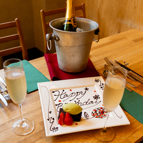 誕生日や記念日など、特別な日の締めくくりには心を込めたメッセージ付きデザートプレートを。シェフ特製のスイーツを華やかに盛り付け、思い出に残る演出をお手伝いいたします。主役の方へのサプライズに、ぜひご利用ください。