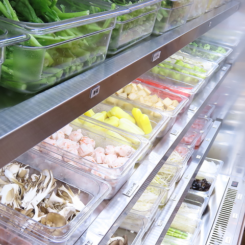 カウンター横にはたくさんの具材が並んでおり、そこからトングとボウルを使ってご自身でお好きな食材を取っていただくことができます♪好きなものを好きなだけ選べるのが当店流!