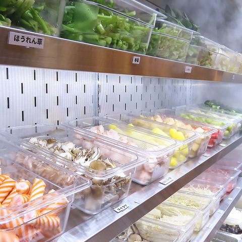 カウンター横には、30種類以上の色とりどりな食材が並んでいます♪トングとボウルを持って、自分で好きな食材を選んでとることができるのが当店の特徴です!
