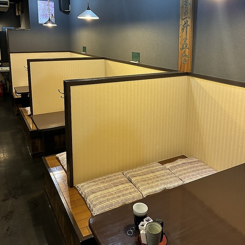 お一人様でもふらっとお気軽にお立ち寄りいただけるカウンター席を完備しております◎周りを気にせずゆったりとくつろげる半個室のようなテーブル席は、最大6名様までご利用可能!また、8名様用のテーブル席もご用意しております。ご家族でのお食事やご友人との集まりにもぴったりな落ち着いた空間です。会話も弾む楽しい時間をお過ごしください