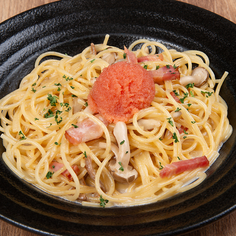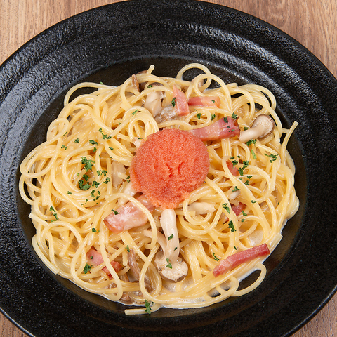 福岡の新定番パスタ!博多料亭 稚加榮の明太子を大胆に使用した贅沢な明太子クリームソースとなっています。ベーコンとポルチーニの相性が抜群で食欲をそそること間違いなし!ぜひご賞味ください♪