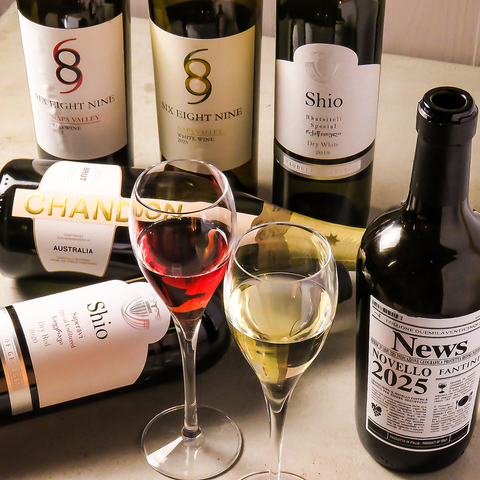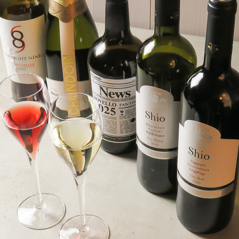赤・白ワインをはじめ、スパークリングや季節限定の銘柄まで幅広くご用意。料理に合うワインを提案します。
