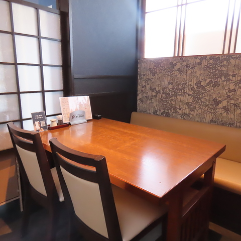 <4名テーブル>4名様でご利用いただけるテーブル席をご用意しております。落ち着いた雰囲気の中で、親しい友人や大切な人との会話を楽しむのに最適な空間です。心地よい和の雰囲気で美味しい料理を味わいながら、リラックスした時間をお過ごしいただけます。