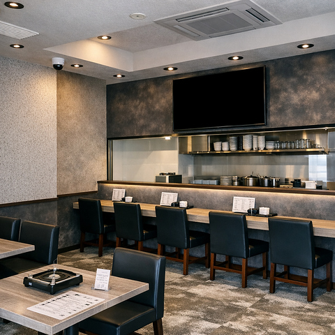 シックな色合いで統一されたカウンター席は、上質で落ち着いた大人の空間。ゆったりとした椅子と程よい照明が、料理と会話を引き立てます。お一人様から少人数まで、静かに食事を楽しめる居心地の良い雰囲気です。