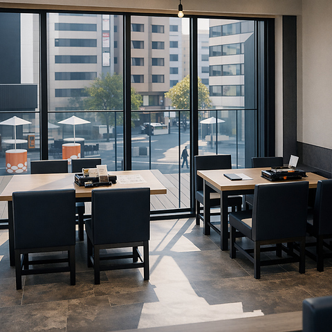 開放感あふれるテラス席は、都会の景色を感じながら立ち飲み空間。心地よい風と自然光に包まれ、昼は爽やかに、夜は落ち着いた雰囲気で過ごせます。仲間との語らいや気分転換の一杯に最適な寛ぎの席です。