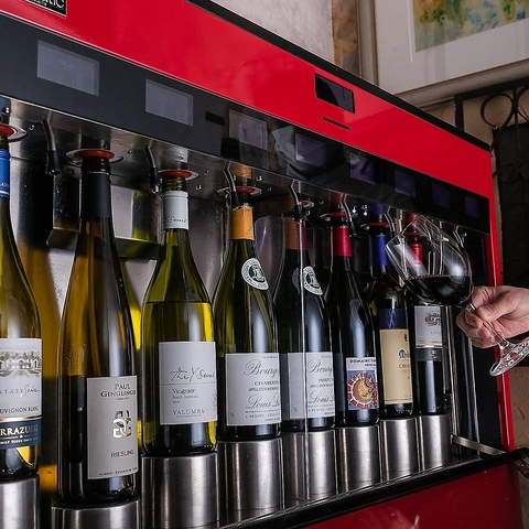 お店の入口では、ワインサーバーにずらりと並んだワインたちがお客様をお出迎えいたします◎旧世界から新世界まで、世界中から厳選した銘柄を豊富に取り揃えております。お料理に合わせて最適な一杯をご提案することも可能です♪グラスワインも赤・白共に充実していますので、まずは気軽にお好みの味を見つけてみてください。