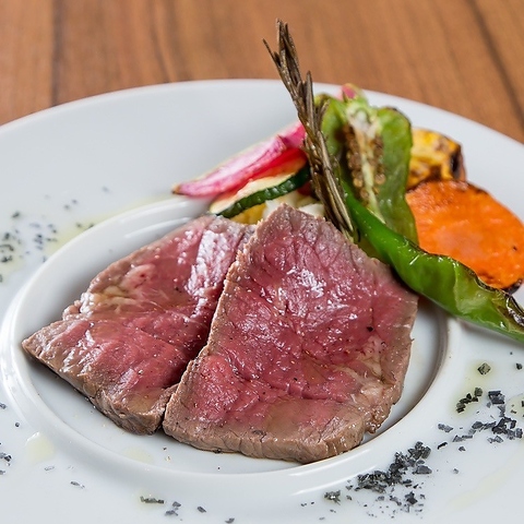 希少なミスジ肉をミディアムレアで。しっとりとした食感と、口の中に広がる濃厚な旨みがたまらない一皿。季節のグリル野菜とともに彩り豊かに仕上げました。