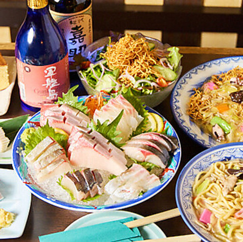 食文化を象徴する「ちゃんぽん」と「皿うどん」は、魚介と豚骨の出汁が効いた深いコクが特徴の逸品です。お食事としてはもちろん、宴の締めくくりにも最適。平戸直送のさつま揚げや五島の鮮魚など、長崎が誇る豊かな海の幸を囲みながら、賑やかな夜をお楽しみいただけます。