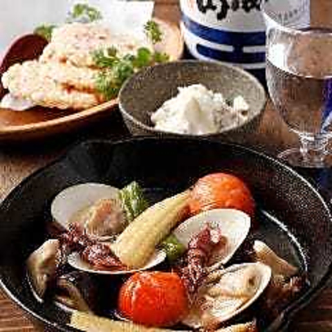 太白ごま油を使用した、蛍いかと蛤のアヒージョ。隠し味には白しょうゆが!
