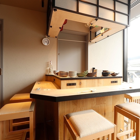 【関内駅からすぐ!】木の温もりが心地よく広がる店内。窓辺の開放感と明るい光が差し込む空間で、ゆっくりとお食事の時間をお楽しみいただけます。カウンターでの特別感も、テーブル席のくつろぎも。
