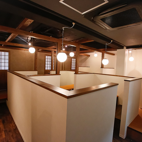少人数のグループに最適な、プライバシーを重視したお席をご用意しております。高い壁が周囲の音を適度に遮ってくれるため、仲間内だけで賑やかに過ごしたい日にも重宝します♪清潔感のある白い壁と温もりのある木目に囲まれて、会話も弾む楽しい夜を演出いたします。