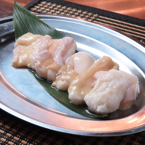 ホルモン好きさんにはたまらない、ホルモン3種盛り!マルチョウ、シマチョウ、そしてコリコリの絶品が一皿に盛り込まれています。各部位の独特な食感や風味を楽しみながら、お手頃な価格で心ゆくまで堪能できる一品です。焼き上がると香ばしい香りが広がり、食欲をそそります。ホルモンの魅力をぜひ存分に味わいましょう!