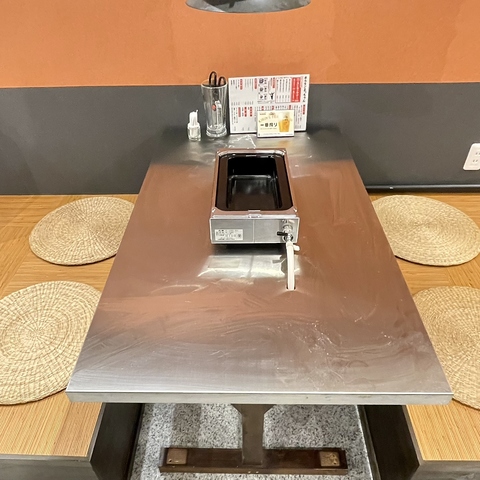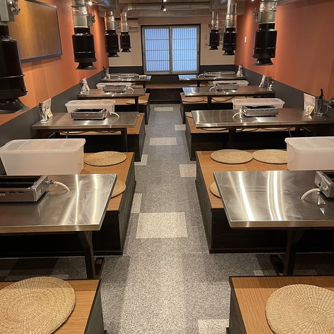 オレンジの壁紙がアクセントになった店内は、シンプルながらも温かみのあるモダンな雰囲気です。各テーブルには強力な排気ダクトを完備しているため、煙を気にせずお食事をお楽しみいただけます。ステンレス製の清潔感あるテーブルと、座り心地の良い円座クッションが用意された小上がり席は、友人同士の飲み会や女子会にも最適です。