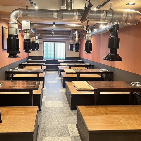 明るく清潔感のある店内には、グループ利用しやすい席を完備しております。各テーブルには排気ダクトが設置されており、お肉を焼く煙を気にせず快適にお食事をお楽しみいただけるのが嬉しいポイントです。大人数での飲み会やご家族での夕食など、幅広いシーンで気軽にご利用いただけます◎
