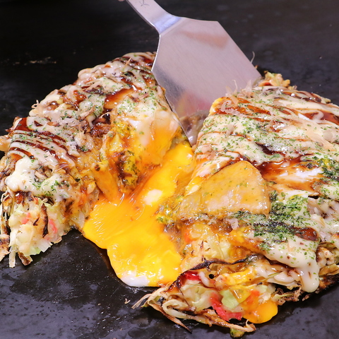 大きい豚肉と半熟の卵を乗せた定番お好み焼き!鉄板でいつ食べても熱々◎