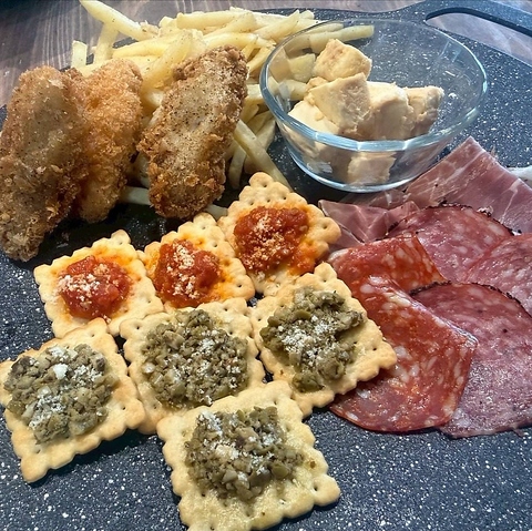 生ハム盛り合わせ・クラッカーブルスケッタ・クリチー味噌漬け・フィッシュ&チップス