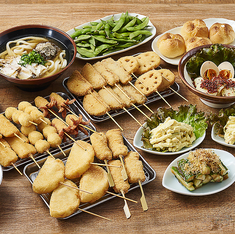 串カツ田中が誇る「大阪名物・串カツ」はもちろん、人気メニュー「かすうどん」や「ポテトサラダ」もお楽しみ頂ける「串カツ田中コース」がオススメ☆串カツ田中の宴会コースは全て2名様からご予約可能、2時間飲み放題付きで4000円(税込)~ご用意しております♪