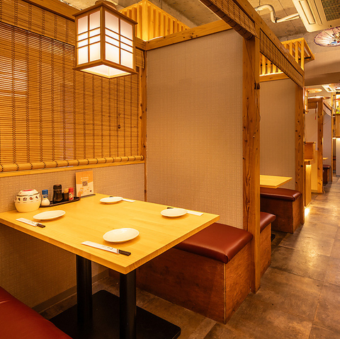 和モダンで落ち着いた雰囲気の半個室席を多数ご用意しております。2名様の少人数から団体様まで、人数に合わせて心地よくご利用いただけます。周りを気にせず、身内だけで水入らずのお食事時間を心ゆくまでお楽しみください。大切な方とのプライベートなひとときを演出いたします