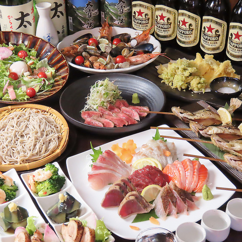 飲み放題2時間付き5500円コースは、前菜から〆まで信州の素材を活かした料理が揃い、大満足の内容です◎突き出しやおばんざい、信州りんごドレッシングサラダなど風味豊かなラインナップに加え、名物の山賊焼きやイワナの塩焼きも楽しめます☆宴会に最適な構成で、4名様から30名様までのご利用可能!
