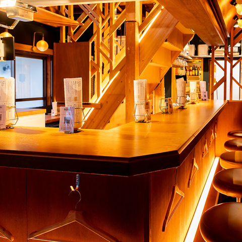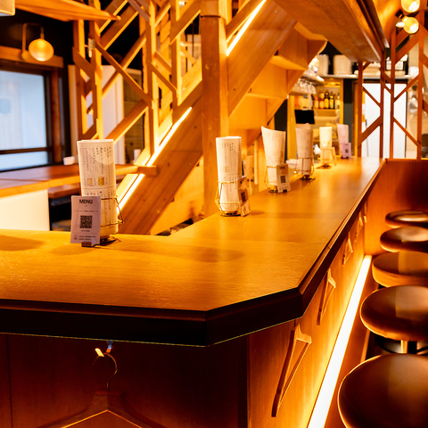 木の温かみが心地よい店内には、お一人様でも気兼ねなく過ごせるカウンター席を完備しております♪柔らかな照明が灯る落ち着いた雰囲気が魅力♪仕事帰りのサク飲みや自分へのご褒美ディナーにも最適です◎友人との会話を愉しむもよし、静かに流れる時間に浸るもよし。都会の喧騒を忘れさせてくれる空間で、至福のひと時を!