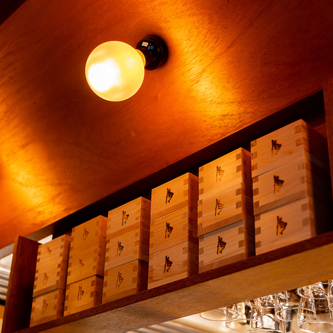 カウンター上部などには、お店のロゴが刻印された「枡」が整然と並べられています。伝統的な和のアイテムをモダンに配置したディスプレイは、お店のコンセプトを象徴するこだわり。細部まで徹底された世界観をぜひ体感してください◎