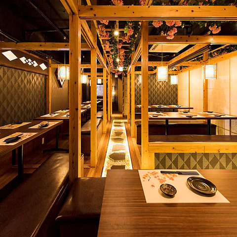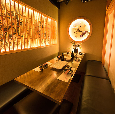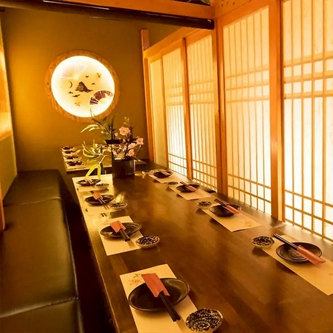 店内は完全個室席を多数ご用意しております♪広々とした完全個室は2名様~団体様まで大小様々なプライベート空間をご用意しており、飲み会や接待・歓送迎会や、記念日といった各種宴会にもご利用いただけます。ゆったりとした和モダンな空間でごゆっくりとお寛ぎくださいませ!!
