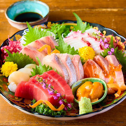 日本酒との相性も抜群!新鮮な海の幸を贅沢に楽しめる刺身盛り合わせ。濃厚な旨みのマグロ、とろける食感のサーモン、上品な甘みのほたて、歯ごたえと旨味のタコ、繊細な味わいの〆サバとカンパチ、豊かなな甘海老の美味しさを存分にご堪能ください。