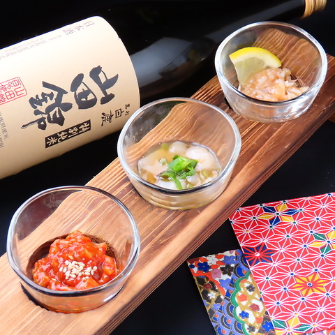 数量限定!鶏皮ぽん酢、いか珍味3種、鯛わたの塩辛など酒の肴メニューも充実◎