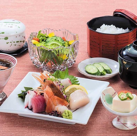 ・刺身・天ぷら小・小鉢2種・サラダ・茶碗蒸し・白飯・汁物・漬物