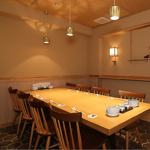 最大10名までの着席が可能な個室もご用意しております。落ち着いた和の雰囲気の個室は、接待や会食、顔合わせなど、さまざまなシーンで利用できる完全なプライベート空間です。大切なお集まりだけでなく、仲間うちでまわりを気にせず盛り上がりたい時にもおすすめです。