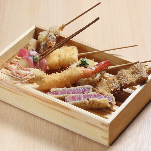 コスパ最強の串揚げコース、天麸羅コースは全19品で4400円(税込)~。お刺身付きのグレードアップや、贅を尽くしたプレミアムコースもご用意。飲み放題プラン(2時間2200円)もぜひご利用ください。
