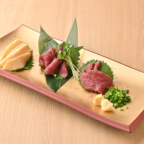熊本名物の馬刺しを甘い九州醤油と薬味でどうぞ。