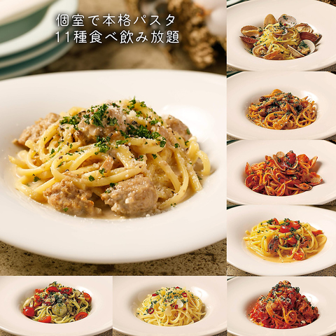 静岡駅前の完全個室で、本格パスタ11種を贅沢に食べ飲み放題。ボンゴレ、ジェノベーゼ、濃厚うにクリームなど多彩な味わいを好きなだけ。周りを気にせず楽しめる個室空間は、会社宴会や打ち上げ、大人の女子会にも最適です。[静岡駅 静駅 個室 肉 イタリアン 居酒屋 バル 食べ放題 飲み放題 女子会 誕生日 宴会 貸切]