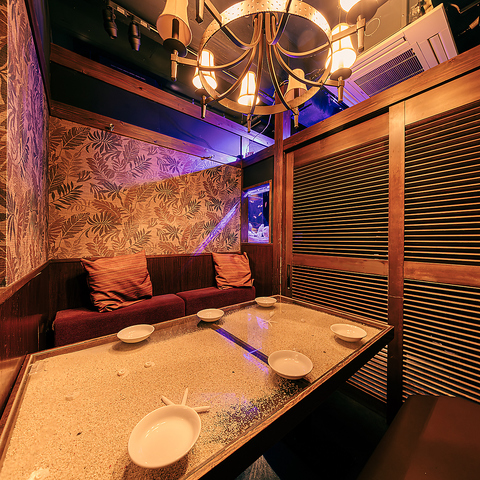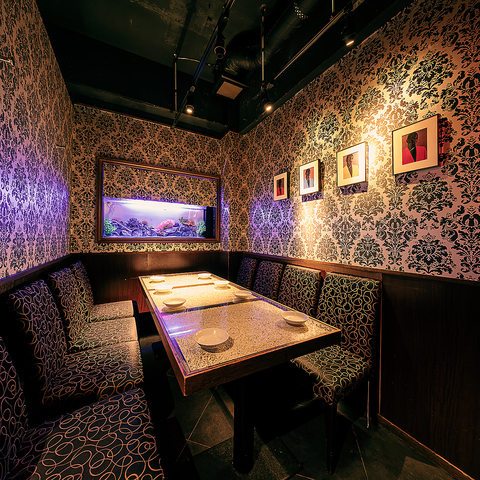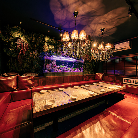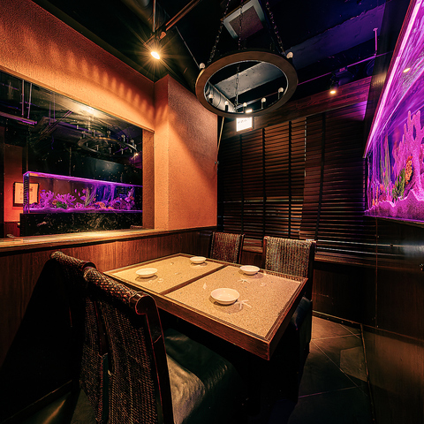 | 個室 | 6名様×1 | 【優雅に味わう極上しゃぶしゃぶ】色鮮やかな熱帯魚が泳ぐアクアリウム個室で、厳選肉のしゃぶしゃぶを。おしゃれなインテリアに囲まれた空間は、いつもより贅沢な女子会や、大切な方のお誕生日祝いに最適です。シャンデリアが灯る幻想的な雰囲気の中、至福のひとときをお過ごしください。(最大6名) |