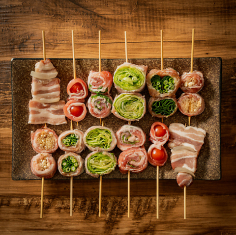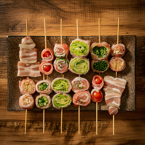 みずみずしい甘みを湛えた季節野菜を選び抜かれた豚肉でふんわりと巻き上げた『野菜巻き』。