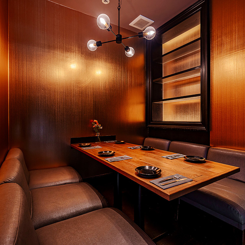 「都会の喧騒を忘れる洗練された個室空間。心地よいソファに身を委ね、極上の料理をゆったりと愉しむ。」