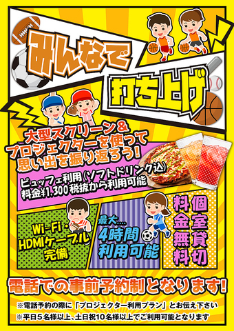個室貸切OK!大型スクリーン&プロジェクター使用し、推し会利用にいかがですか?各国料理をビュッフェスタイルでお楽しみいただきながら、推し活可能です♪※電話での事前予約制となります。電話予約の際に「プロジェクター利用プラン」とお伝えください。平日5名、土日祝10名様以上で利用可能です。
