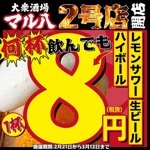 2026年2月27日開店!!これを記念して、マル八にちなんで<1杯8円>キャンペーンを開催します♪生ビール・ハイボール・レモンサワーが何杯飲んでも1杯8円♪破格の安さは期間限定!!2月21日のプレオープンから3月12日まで!!【松山 居酒屋 大衆酒場 郷土料理 焼き鳥 餃子 牡蠣 天ぷら 海鮮 宴会 女子会 歓送迎会】