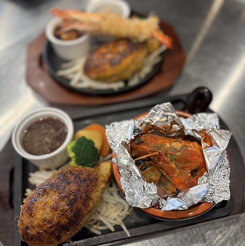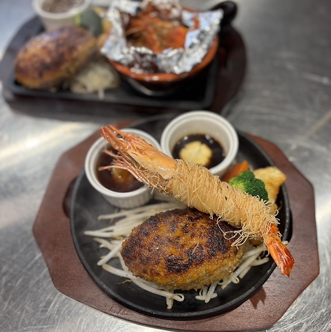 こんがりジューシーに焼き上げたハンバーグからあふれる肉汁。その横には、衣はサクッと香ばしく、中はぷりっと甘い海老が弾ける自慢の海老フライ。熱々のハンバーグを頬張った次の瞬間、海老フライの軽やかな食感をお楽しみください!