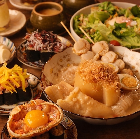 酒場のあて巻きと貝出汁おでん。
