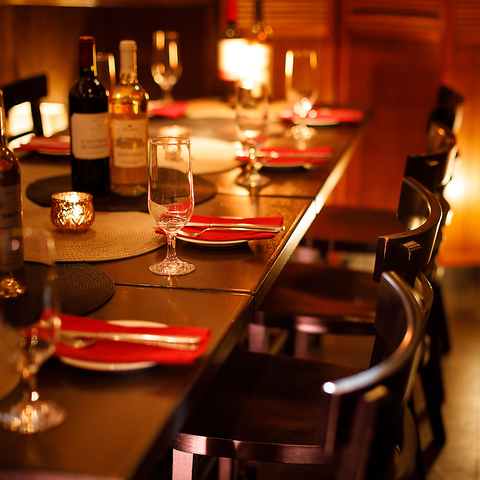 デートや友人同士の食事にちょうど良いテーブル席をご用意。落ち着いた空間で、目の前でカットされるシュラスコのライブ感も楽しめます。ほどよい距離感で会話がしやすく、ゆったりと食事を楽しめる店内です。