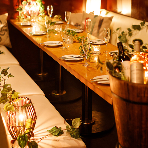 忘新年会・合コン・女子会・誕生日会にぴったりの広々とした空間。TVモニターやDVD完備で、映像や音楽を楽しみながらのパーティーにも最適です。最大70名様まで貸切OKなので、大人数の宴会やイベントにも対応可能。おしゃれで雰囲気抜群の席で、完全プライベートな空間を満喫できます。