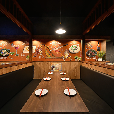 2名~4名での利用にぴったりなテーブル席や半個室空間も完備。赤いレザーのソファ席や木目調のテーブルが落ち着きある雰囲気を演出し、カラフルな壁画が非日常感をプラス。ちょっとしたデートや友人との食事、仕事帰りの軽い飲みなど、カジュアルに楽しめる空間です。