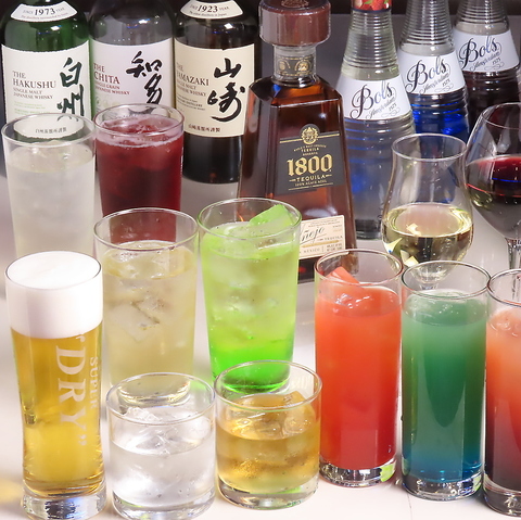 飲み放題は150種類と圧倒的なラインナップ!サワー、カクテル、ハイボール、世界各国の多種多様なリキュールなどをご用意しています。カクテルだけで100種類あり、写真映えするカラフルな一杯は女性にもおすすめ♪ソフトドリンクも充実しておりますので、お酒が飲めない方でもお楽しみいただけます。