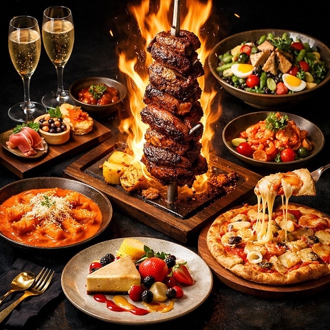 炎のシュラスコを堪能できるスペシャルプランなど、飲み放題付のコースを各種ご用意!料理メニューもピザ、パスタ、デザートなど豊富にございます。宴会や女子会、各種記念日など、幅広いシーンでお楽しみいただけます♪食後のデザートまで、心ゆくまでご堪能くださいませ。