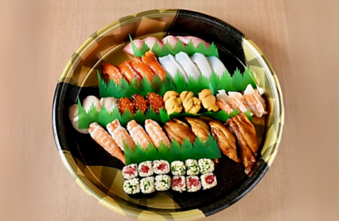 本鮪中トロ、紋甲鳥賊、帆立、国産生サーモン、本鮪鉄火巻き、カッパ巻き玉子、いくら軍艦、特大ふわとろ一本煮穴子 ※玉子はすり身入り玉子に変更になります