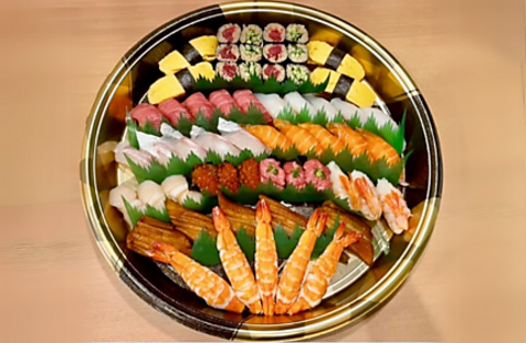 本鮪赤身、紋甲烏賊、赤海老、ネギトロ軍艦、玉子、国産生サーモン、蒸し海老、帆立、本鮪鉄火巻、カッパ巻、特大ふわとろ一本煮穴子